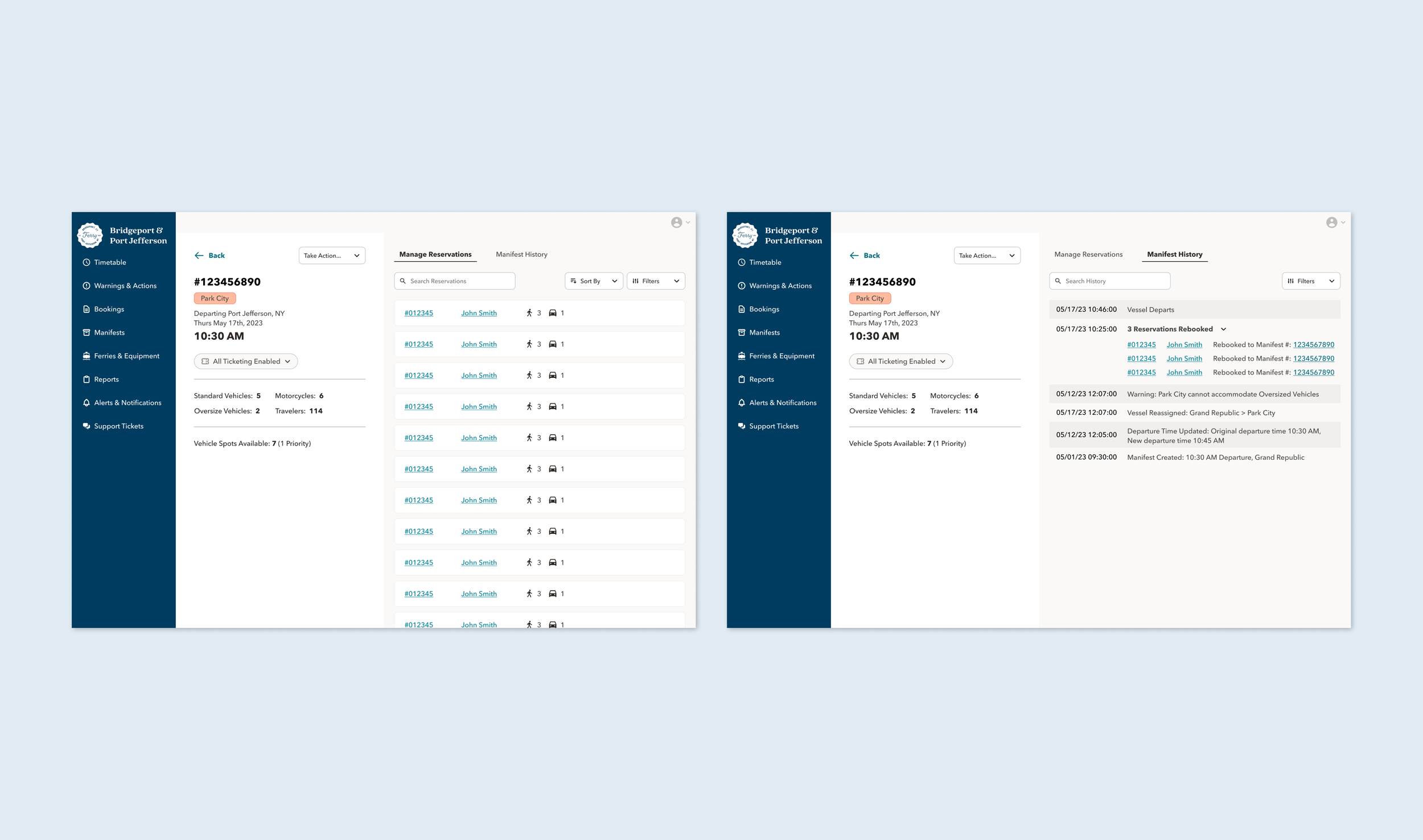 Manifest management view keeps capacity and departure context visible while staff manage reservations