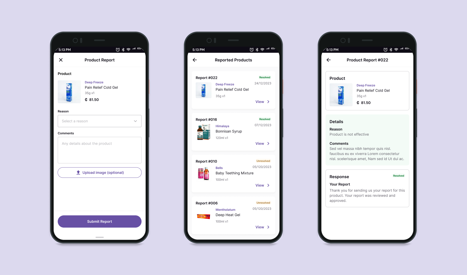 Product reporting flow lets users submit an issue, track over time, and view pharmacy responses.