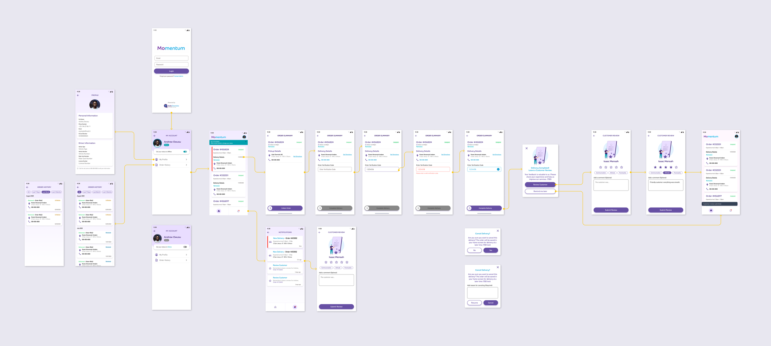 Driver app flow, clear path from assignment to delivery to completion (customer feedback).